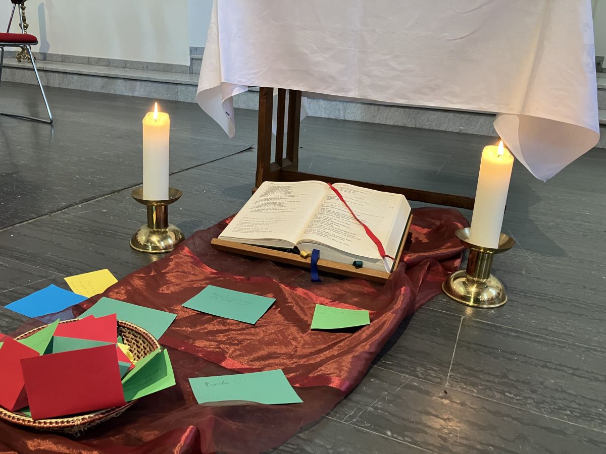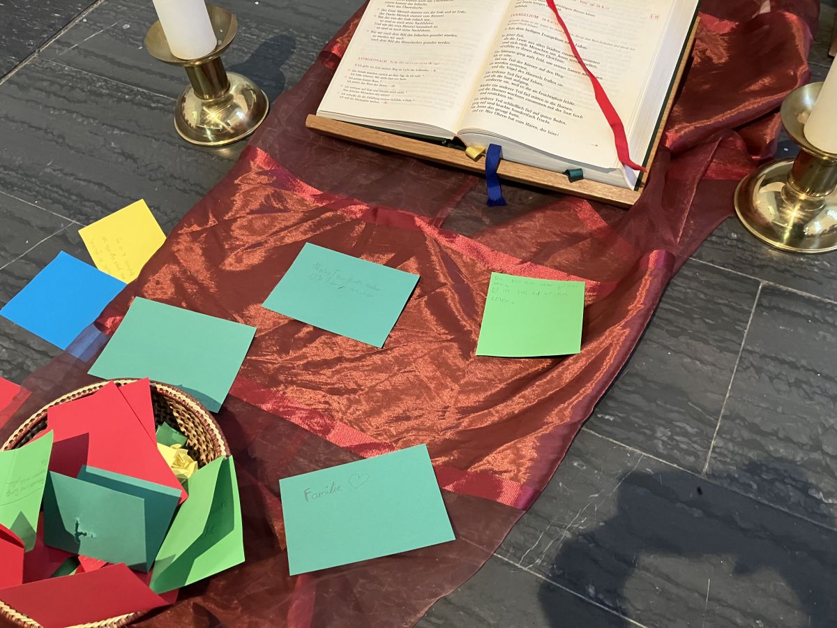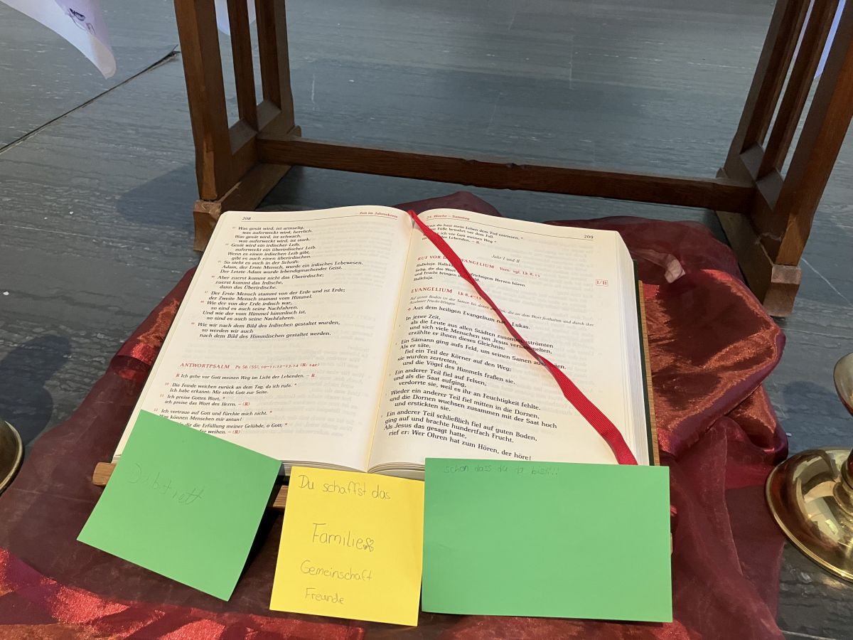 Im Verlauf des Gottesdienstes schrieben die Schülerinnen und Schüler Worte auf, die ihnen im Alltag Kraft geben und die sie gerne hören. Diese Worte wurden vorgelesen und miteinander geteilt. Genannt wurden Sätze wie: „Wie schön, dass du da bist“, „Du schaffst das“, „Du bist nett“, „Du bist gut“, „Du bist wertvoll“, „Du bist wichtig“, „Das hast du gut gemacht“ oder „Du bist meine Freundin“ beziehungsweise „Du bist mein Freund“.