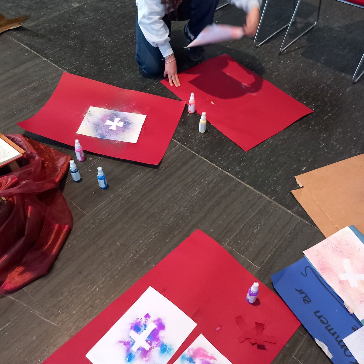 In einer Pause haben Schülerinnen und Schüler in der kreativen Zeit farbintensive Kreuze gestaltet, die besonders in der Passions- und Osterzeit in den Blick rücken. Mithilfe von Schablonen und Sprühfarben entstanden individuelle Arbeiten in persönlichen Lieblingsfarben.