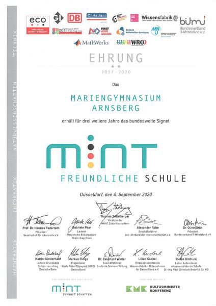 Große Freude am Mariengymnasium. Die Initiative MINT Zukunft schaffen hat die Schule in diesem Jahr als MINT-freundliche Schule rezertifiziert.
