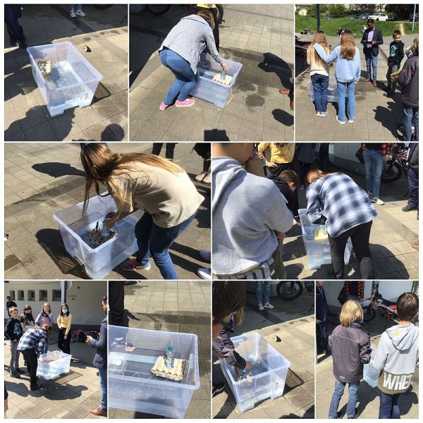 Weil das Thema „Schiff ahoi!“ lautete, erhielten die Schülerinnen und Schüler folgende Aufgabe: Baut aus Eierkartons ein möglichst leichtes Boot, auf dem eine Wasserflasche stehen kann, während es in einem Becken schwimmt. Tretet in Gruppen gegeneinander an. Gewonnen haben die Teams mit den leichtesten Booten, die die Anforderungen erfüllen.