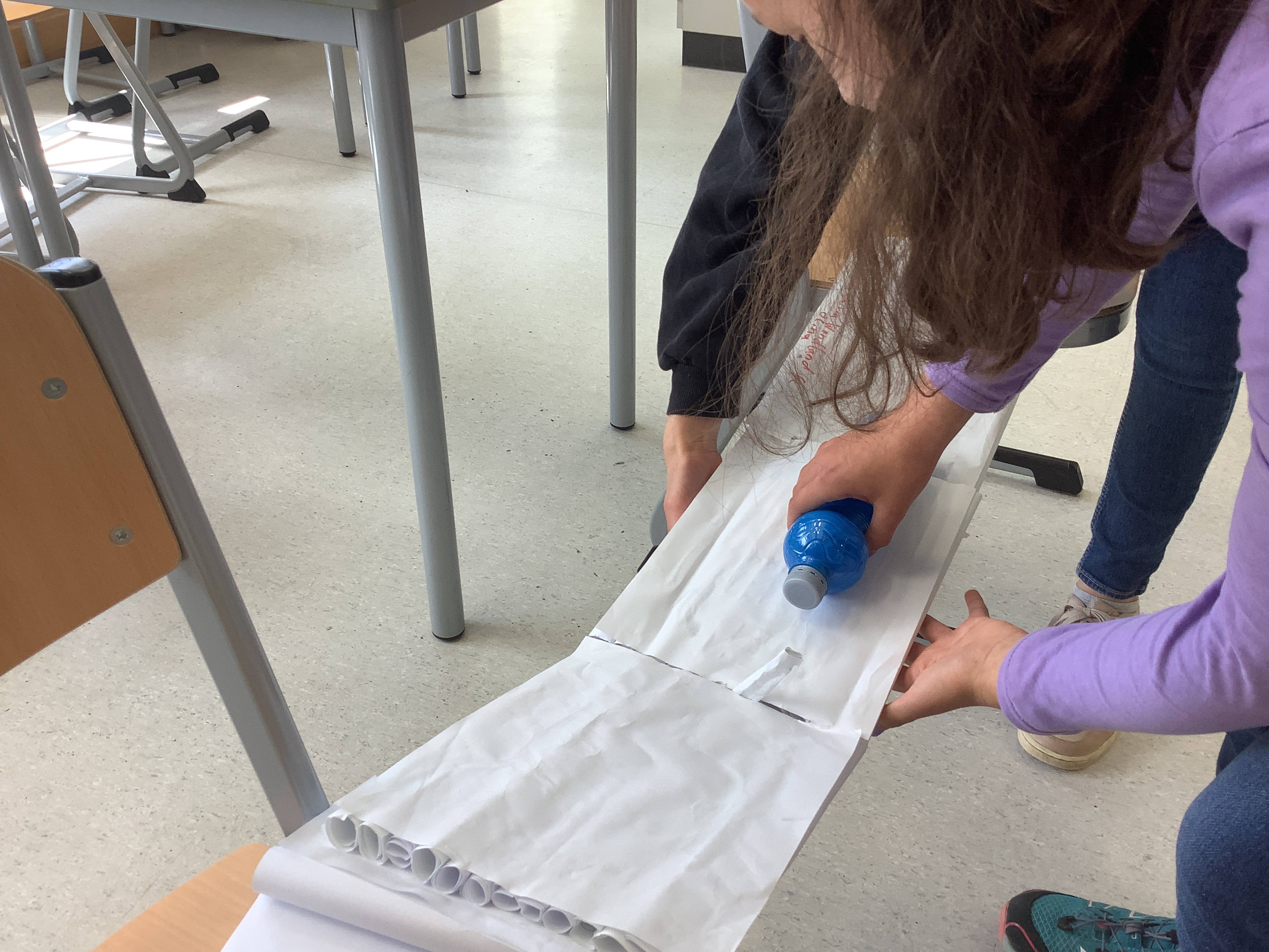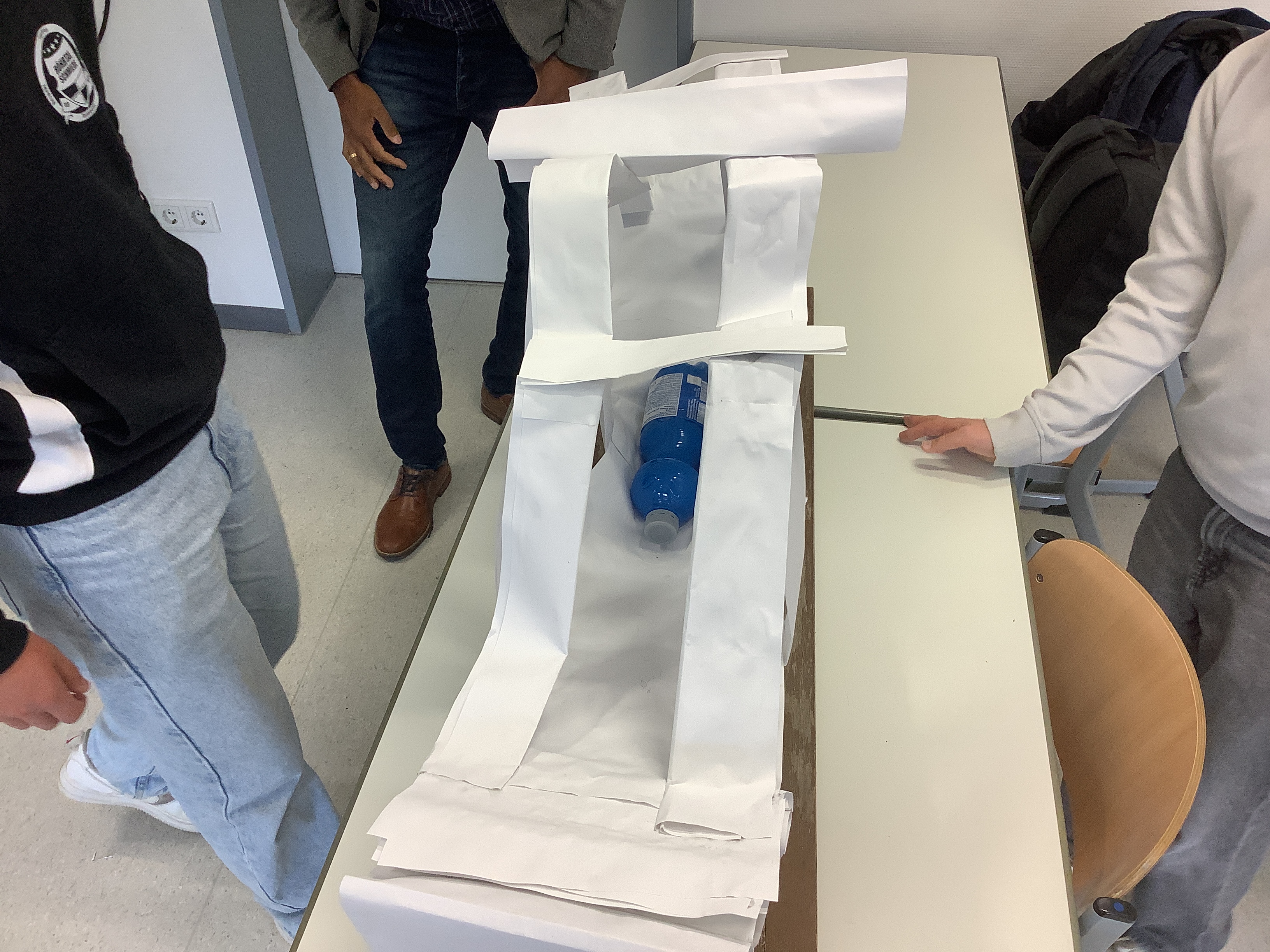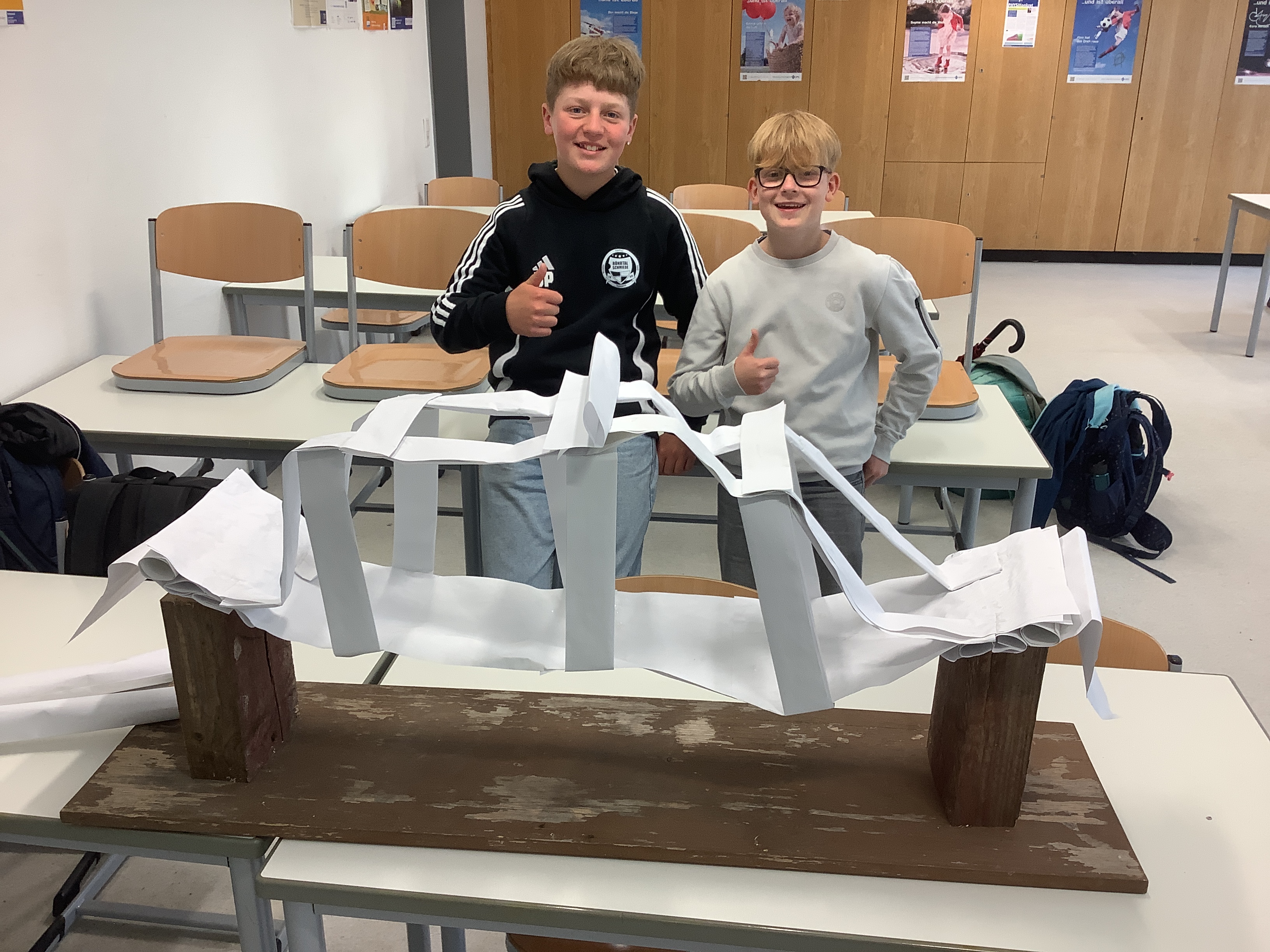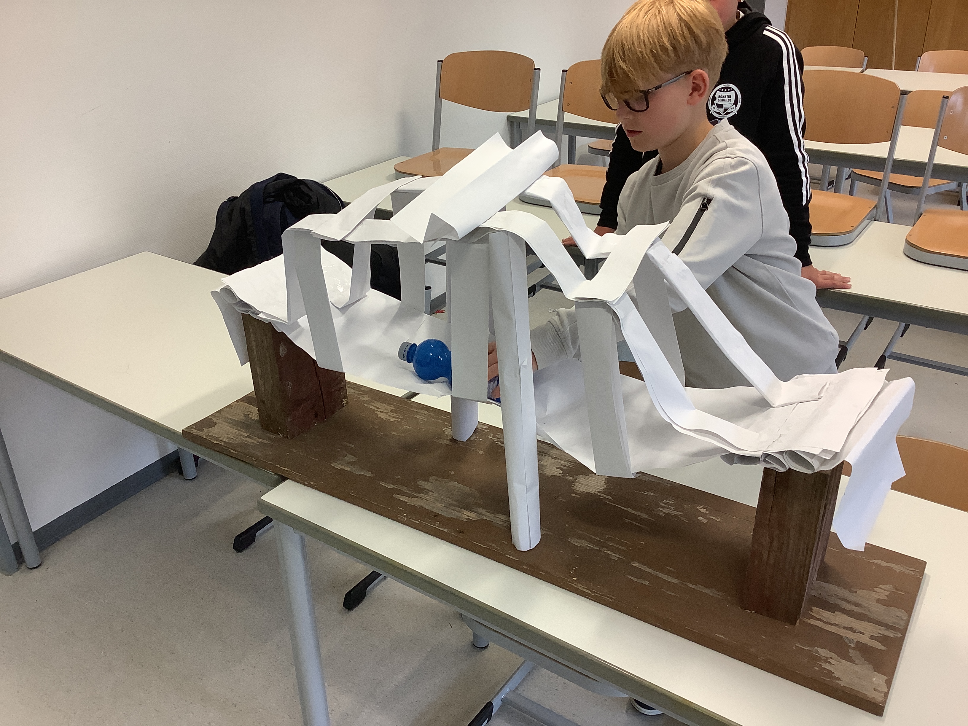 Die Herausforderung bestand darin, aus Papier eine möglichst leichte Brücke zu konstruieren, die dennoch in der Lage ist, eine Wasserflasche zu tragen. Die Schülerinnen und Schüler traten in Teams gegeneinander an, die Gruppen mit den leichtesten tragfähigen Brücken gingen als Sieger hervor. Die Bewertung und Begleitung übernahmen die Physiklehrer Herr Markwald und Herr Victor. Schon im Vorfeld waren einige Hürden zu meistern, auch der Transport der fertigen Brücken zur Schule erwies sich als anspruchsvoll.