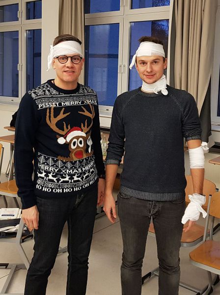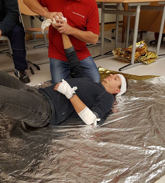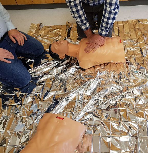 Unter der Leitung von Herrn Schlimbach vom Deutschen Roten Kreuz standen Themen wie Wundversorgung, stabile Seitenlage, Herz-Lungen-Wiederbelebung, der Umgang mit dem Defibrillator, das Abnehmen eines Motorradhelms und vieles mehr auf dem Programm, was in zwei vierstündigen Lerneinheiten geübt wurde.So sind die Ersthelfer Frau Büenfeld, Frau Entian, Herr Ante, Herr Becker, Herr Cornelsen, Herr Kirschner, Herr Porombka und Herr Heinemann gut gerüstet.