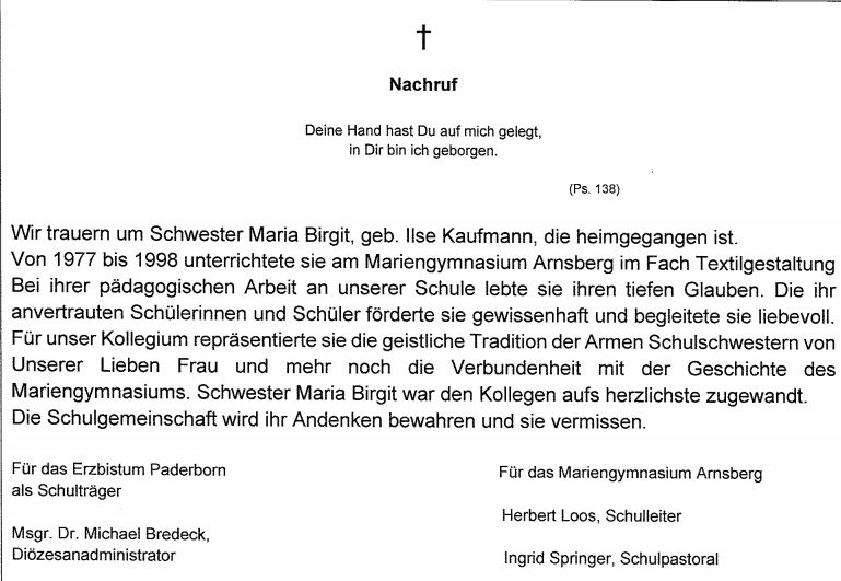 Wir trauern um Schwester Maria Birgit, geb. Ilse Kaufmann, die heimgegangen ist. Von 1977 bis 1998 unterrichtete sie am Mariengymnasium Arnsberg im Fach Textilgestaltung. Bei ihrer pädagogischen Arbeit an unserer Schule lebte sie ihren tiefen Glauben. Die ihr anvertrauten Schülerinnen und Schüler förderte sie gewissenhaft und begleitete sie liebevoll. Für unser Kollegium repräsentierte sie die geistliche Tradition der Armen Schulschwestern von Unserer Lieben Frau und mehr noch die Verbundenheit mit der Geschichte des Mariengymnasiums. Schwester Maria Birgit war den Kollegen aufs herzlichste zugewandt.