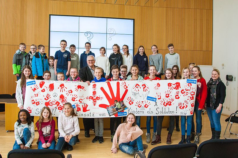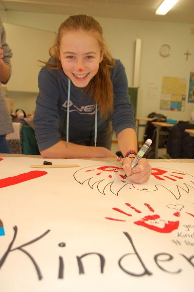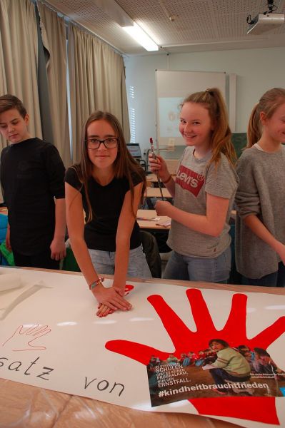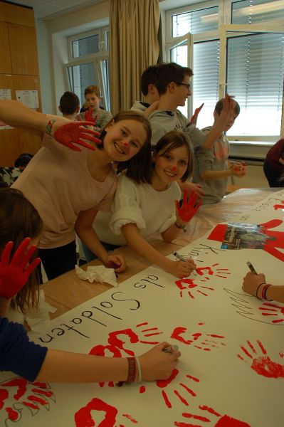 Anlässlich der von Unicef Sauerland ausgerufenen Aktion „Gib deinen roten Handabdruck“ informierten wir, die Klasse 7a, uns am 5. Februar über das Schicksal von über 250 000 Kindern und Jugendlichen, die in vielen Ländern der Erde als Kindersoldaten in Kriegen und bewaffneten Konflikten eingesetzt werden.