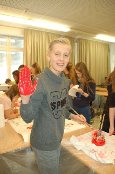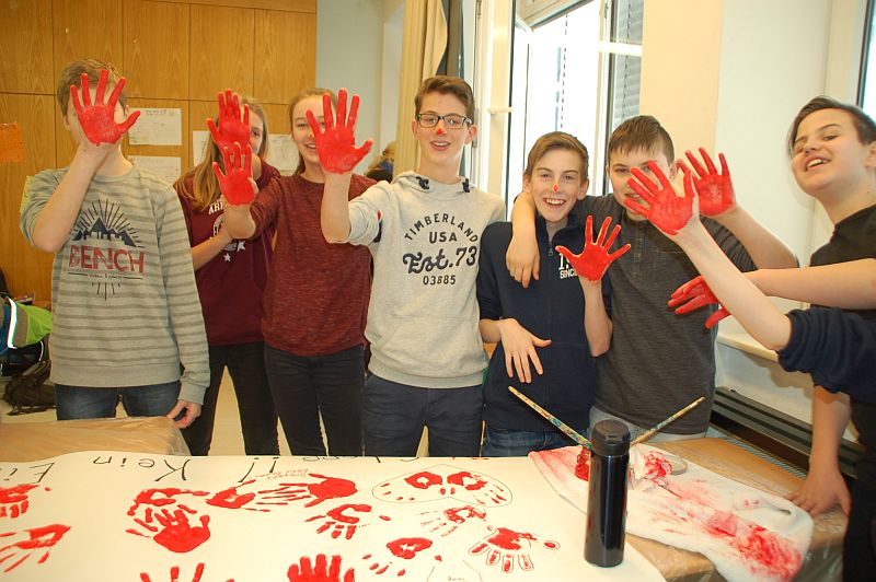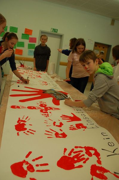 Bei einer gemeinsamen Aktion im Klassenraum hatten wir viel Spaß dabei, unsere Hände mit roter Farbe zu bestreichen und auf ein langes Banner zu drücken. Einige Schüler waren auch sehr kreativ und gestalteten aus ihren Handabdrücken z .B. Herzen oder Friedenstauben.