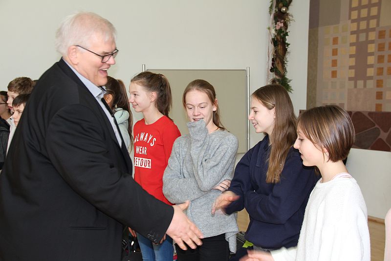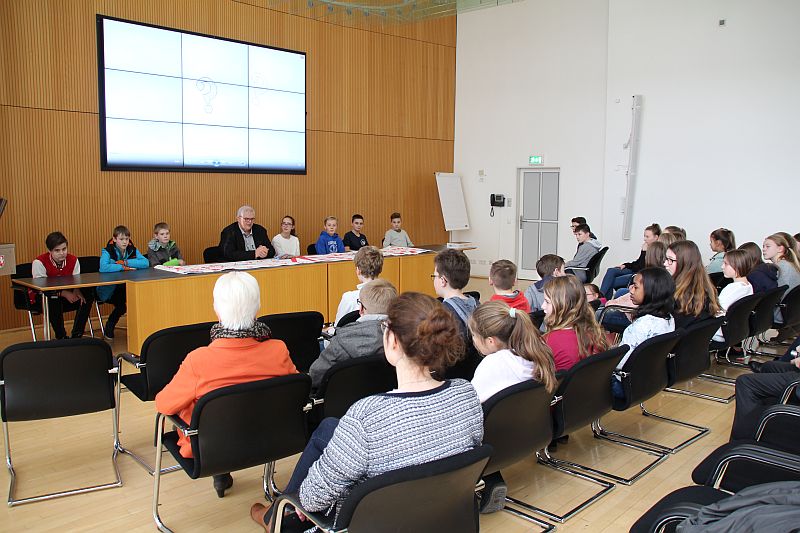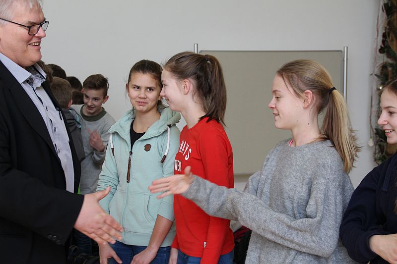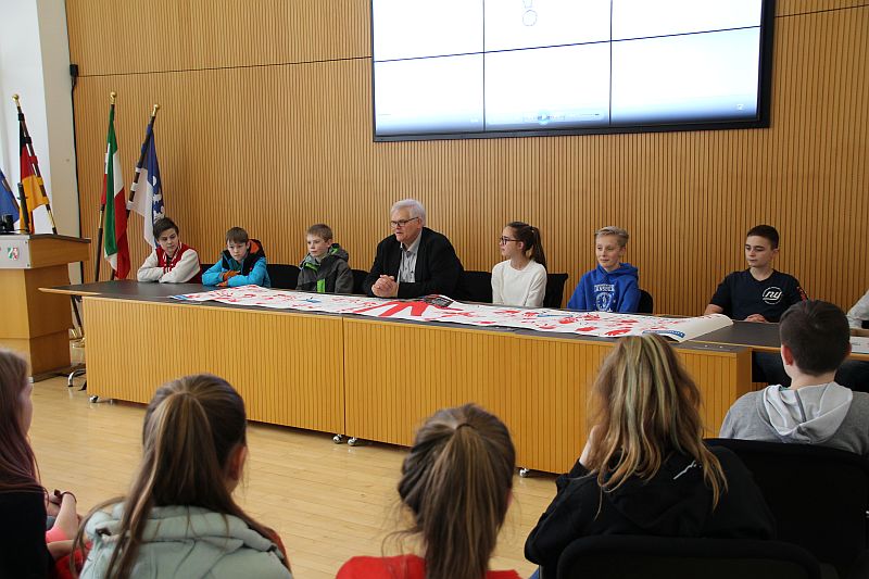 Unsere Botschaft übergaben wir mit unserer Klassenlehrerin, Frau Humpert, am 16.02.2018 dem Regierungspräsidenten Herrn Vogel. Dafür machten wir einen Ausflug zur Bezirksregierung. Herr Vogel nahm sich Zeit für unser Anliegen und versprach, das Banner in der Bezirksregierung aufzuhängen.