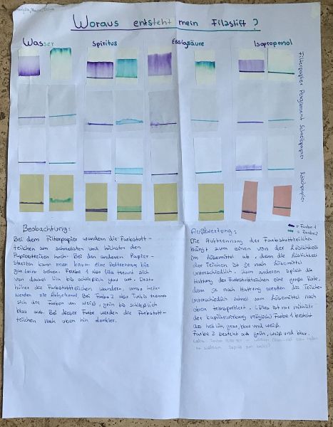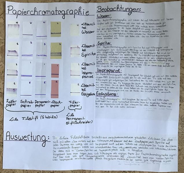 In den letzten Wochen haben wir Schüler der 7. Klasse im Chemieunterricht bei Frau Heimke ein besonderes Projekt durchgeführt: die Papierchromatographie. Dabei handelt es sich um ein Stofftrennungsverfahren. In unserem Fall haben wir Filzstiftfarben und Permanentmarker in ihre einzelnen Farbstoffteilchen zerlegt. Dieses haben wir mit verschiedenen Lösemitteln und Papierarten ausprobiert. Die Ergebnisse haben wir auf einem Plakat festgehalten. Dort haben wir unsere Beobachtungen ausgewertet und die