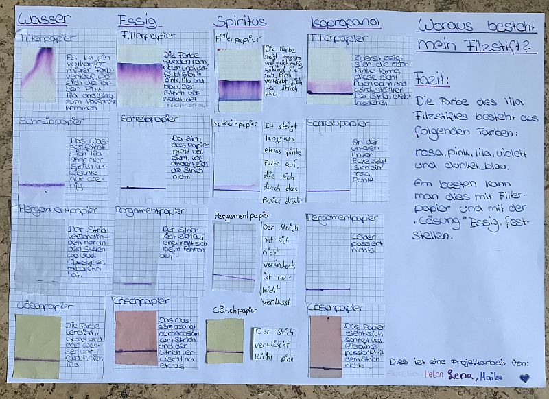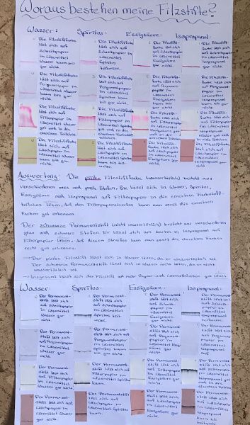 Das Projekt, indem die Schüler herausfinden sollten, woraus Filzstifte bestehen, wurde in allen Klassen der Jahrgangsstufe 7 durchgeführt. Anbei zwei Berichte von Schülerinnen aus der Klasse 7b.