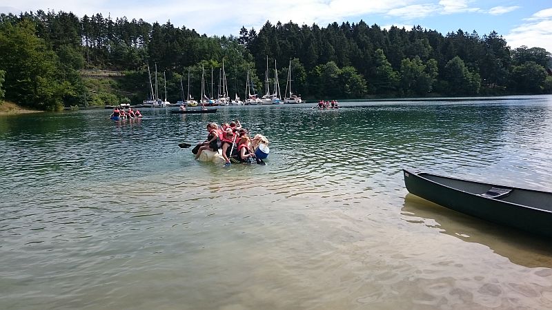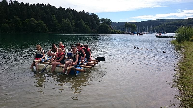 Jedes Team erhielt dafür eine bestimmte Anzahl Holzpfähle, neun große Kanister und viele Meter Band. Hinterher schaffte es jedoch nur ein Team wieder trocken an Land. Die anderen zwei Teams sind mit ihren Flößen baden gegangen. Nachher war noch Zeit für Ballspiele oder Ähnliches. Zum Schluss gab es ein gemeinsames Grillen, bei dem sich die Schüler mit Bratwurst im Brötchen oder, je nach Geschmack, auch mit Hähnchenfilets im Brötchen stärken konnten. Alle hatten sehr viel Spaß.