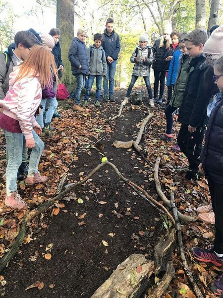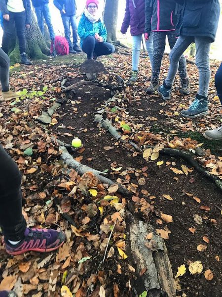Nach einem gemeinsamen Frühstück in der Klasse, starteten alle gut gelaunt Richtung Eichholz. Bei verschiedenen Spielen konnten die Schülerinnen und Schüler u.a. ihr Wissen zu den Tieren des Waldes testen, aber auch erfahren, wie wichtig jeder Einzelne für die Klassengemeinschaft ist und dass man nur als Team gut zusammenarbeiten kann. Neben dem Besuch des „Flüsterhäuschens“ bauten die Schüler in Teams Kugelbahnen aus Naturmaterialien. Alle waren eifrig und kreativ bei der Sache, so dass jedes Team zum Schluss stolz ihre gelungene Kugelbahn präsentieren konnte.