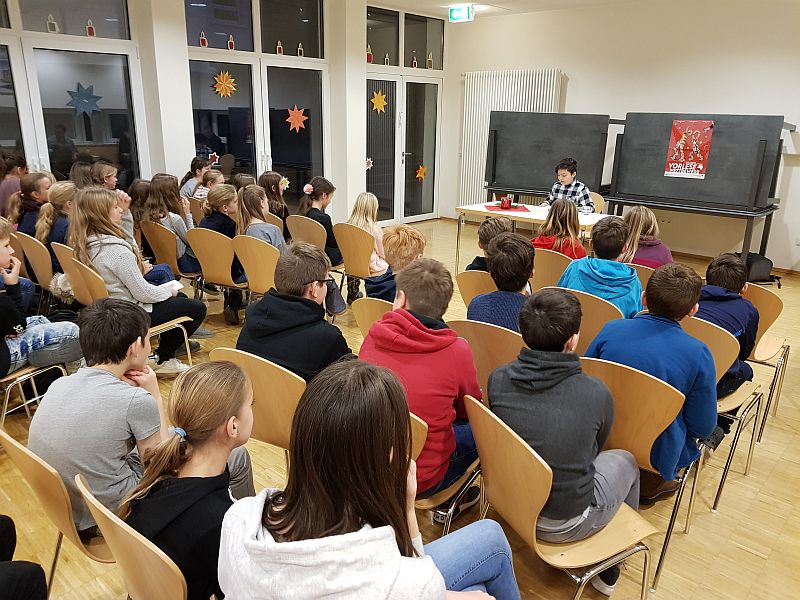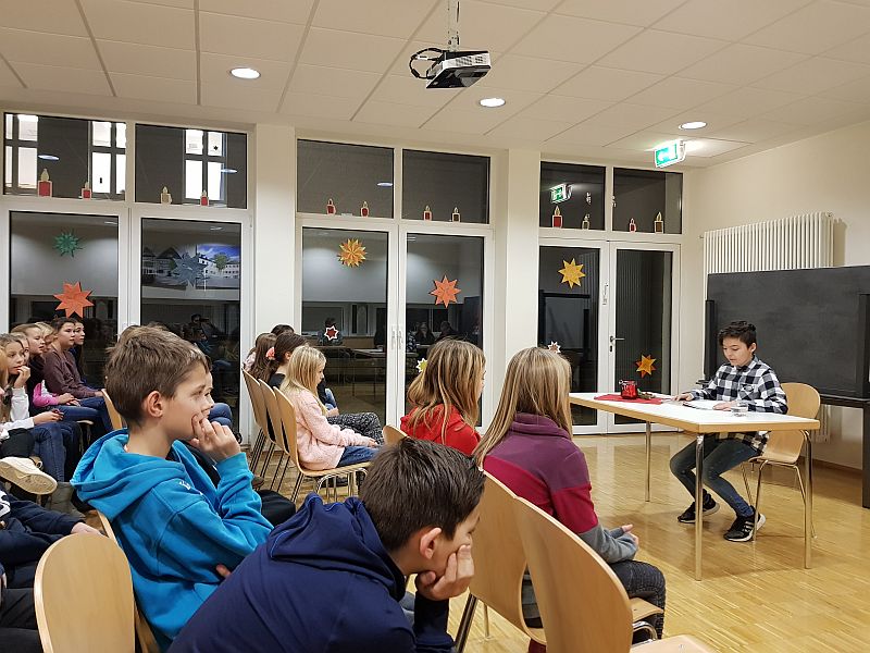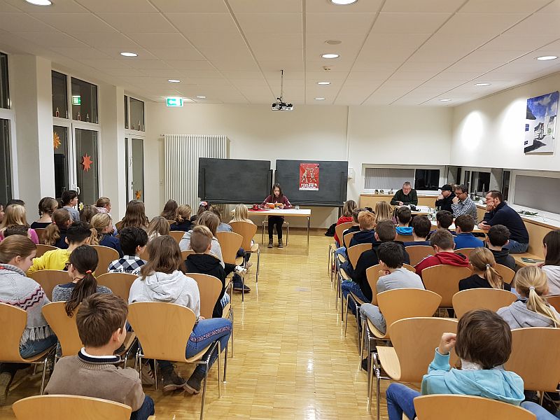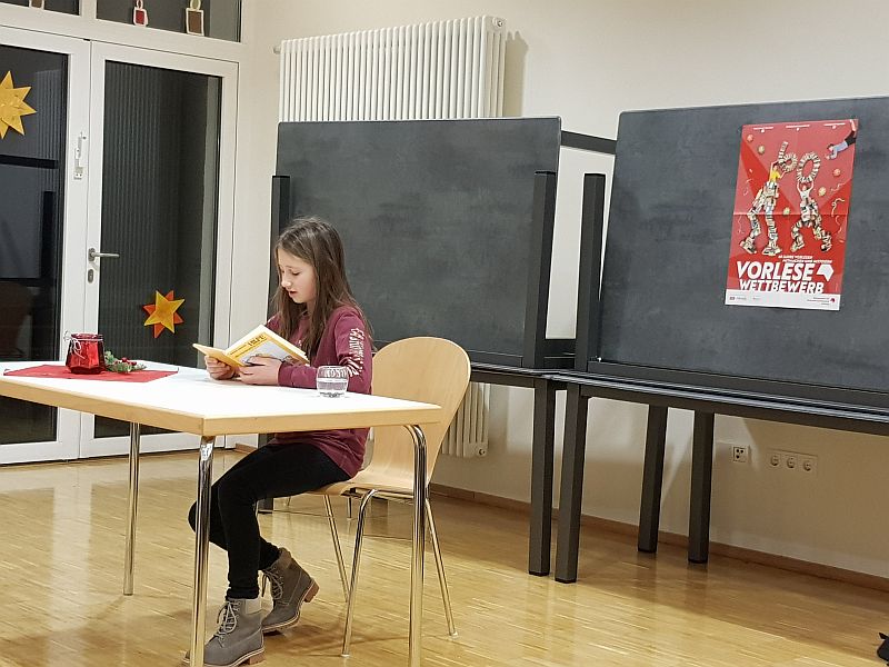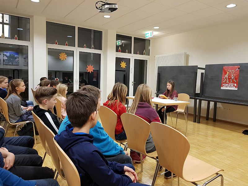 Wie jedes Jahr im Dezember versammelte sich die gesamte Jahrgangsstufe 6 in der Cafeteria des Mariengymnasiums, um den Schulsieger im Vorlesen zu küren. Die beiden Klassensieger Miguel Luis Goncalves (6a) und Linnea Moess (6b) machten es der Jury, bestehend aus Herrn Fette (langjähriger Deutschlehrer), Herrn Porombka (Hausmeister) sowie Alina Bause und Sina Kloos (Vertreterinnen der SV), nicht leicht, einen Sieger zu ermitteln. Denn beide Vertreter begeisterten das Publikum, das neugierig und gespannt den vorgelesenen Textauszügen lauschte.
