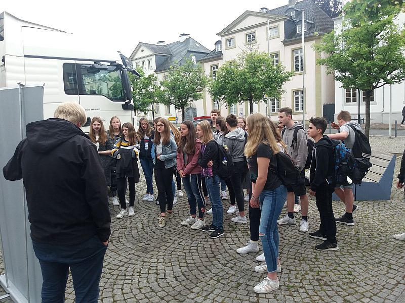 Am Donnerstag, den 6. Juni 2019 besuchten 27 Schülerinnen und Schüler des Jahrgangs 9 den missio-Truck zum Thema „Menschen auf der Flucht“, der in Arnsberg auf dem Neumarkt Station machte.