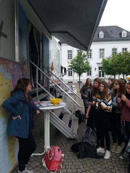 Nach einer Einführung über die Situation im Kongo, in der den Schülerinnen und Schülern anhand des Beispiels `Rohstoffe für Smartphones‘ der Lebensweltbezug des Themas deutlich gemacht wurde, konnten sie sich für einen Flüchtling entscheiden, dessen Rolle sie während des Besuchs des Trucks einnehmen konnten. So wurde den Schülerinnen und Schülern sehr lebendig vor Augen geführt, was es bedeutet in einem Bürgerkriegsland zu leben, welche schwerwiegenden Entscheidungen man auf einer Flucht treffen muss, wie gefährlich und lang die Flucht häufig ist und welche Schwierigkeiten den Flüchtlingen begegnen – sowohl auf der Flucht als auch in Deutschland oder anderen Ländern, wo sie Asyl suchen.