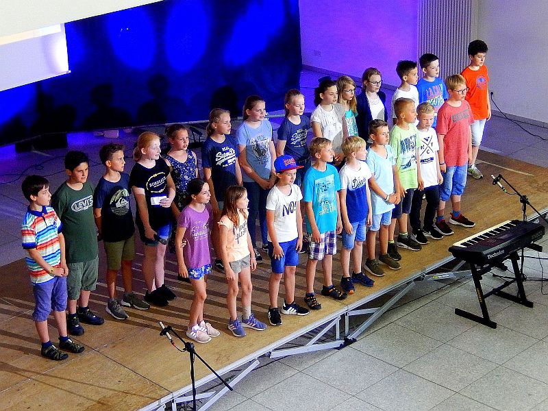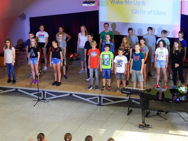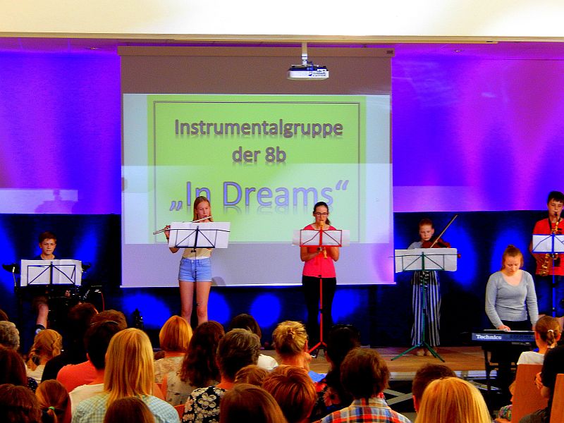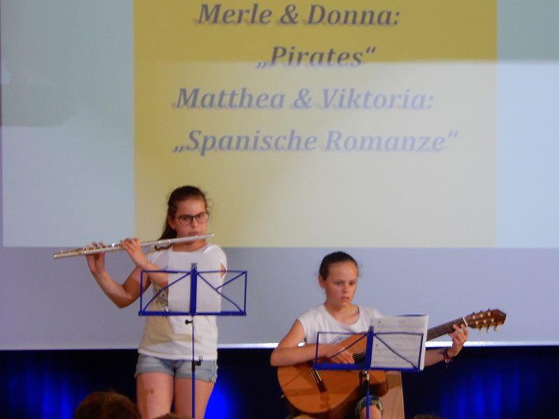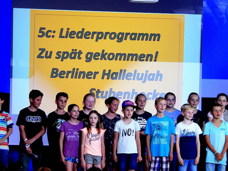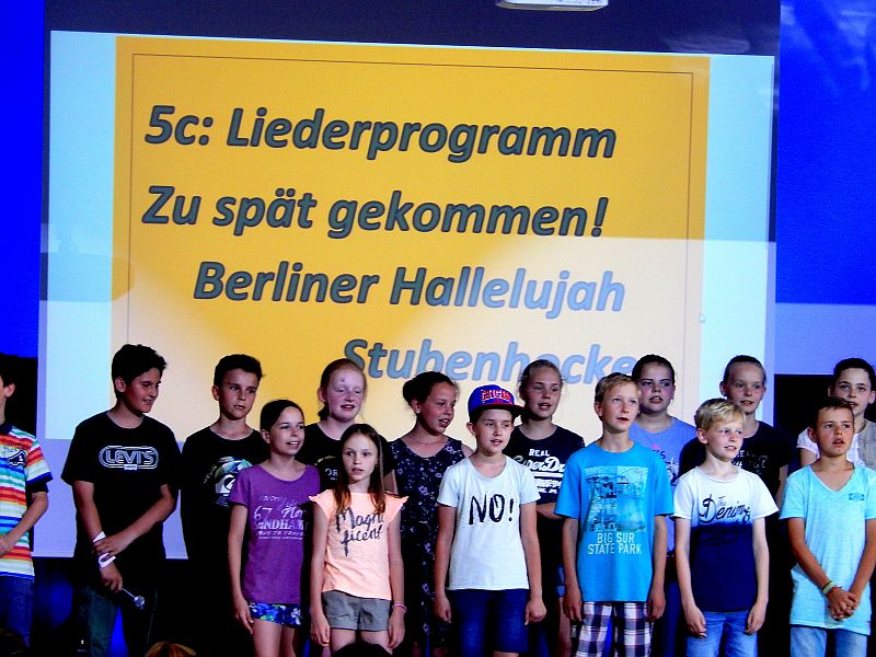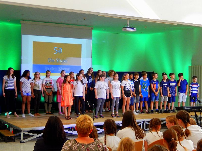 Für Instrumentalklänge hatte sich eine Gruppe aus der 8b für einen Filmmusik–Titel eingefunden. Am Beginn der Show stimmte die 5c das Auditorium u. a. mit dem Lied vom Stubenhocker ein. Die Jungen der 6b gewährten mit „Riff & Bausteine“ einen Einblick in die Unterrichtswerkstatt: Hier kamen Schlaginstrumente, Boomwhacker und Tasteninstrumente zum Einsatz.Mit stimmungsvollen Solobeiträgen wussten Merle und Donna (Violine und Klavier) sowie Viktoria und Matthea (alle vier aus er 5b) zu gefallen. Eine eigene „Show in der Show“ lieferte die 5a ab. Nach einem gemeinsamen Lied bot die Klasse eine abwechslungsreiche Palette kurzer Gruppenbeiträge von Tanz über Sketche und Bodenakrobatik bis zu Instrumentalmusik, wobei Johannes mit einem Klavierstück von Claude Debussy beeindruckte.