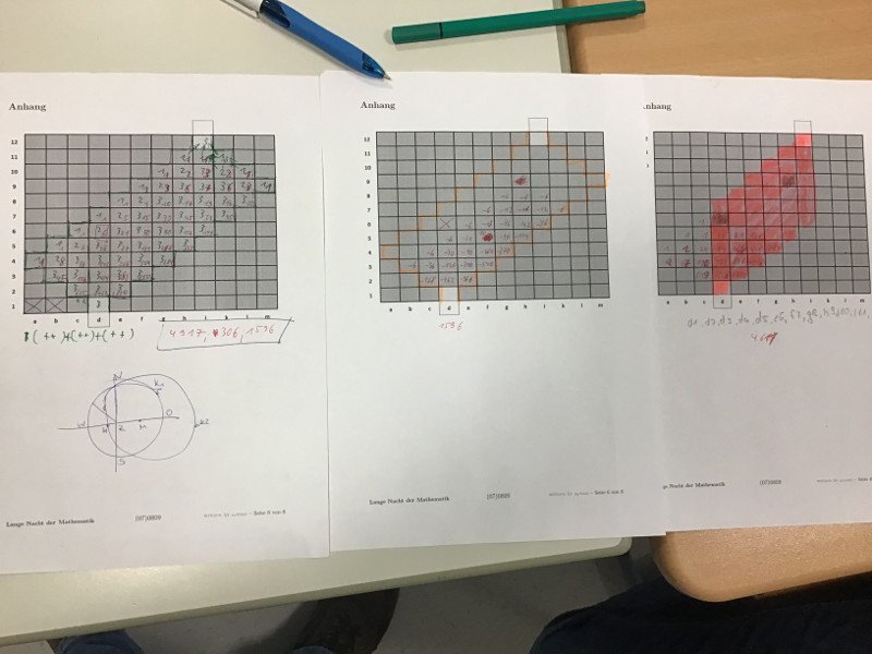 Am 22.11.2019 fand am Mariengymnasium wieder die „Lange Nacht der Mathematik“ statt. Etwa 230 Schülerinnen und Schüler hatten sich angemeldet, um sich, teilweise bis in die frühen Morgenstunden, mit allerlei mathematischen Aufgaben auseinanderzusetzen. Begleitet von einigen Eltern sowie Lehrerinnen und Lehrern wurde wieder geknobelt, probiert, programmiert, gemessen, gerechnet, versucht, verzweifelt, sich und andere motiviert, aber auch gelacht, gegessen, getrunken und getanzt.