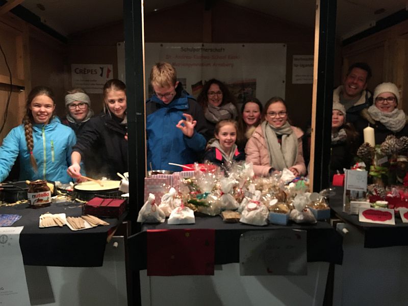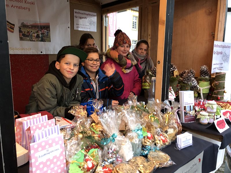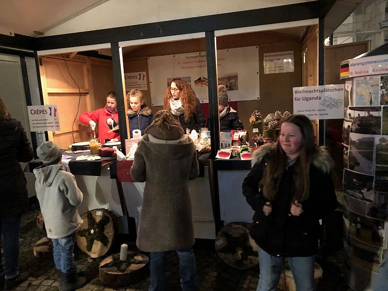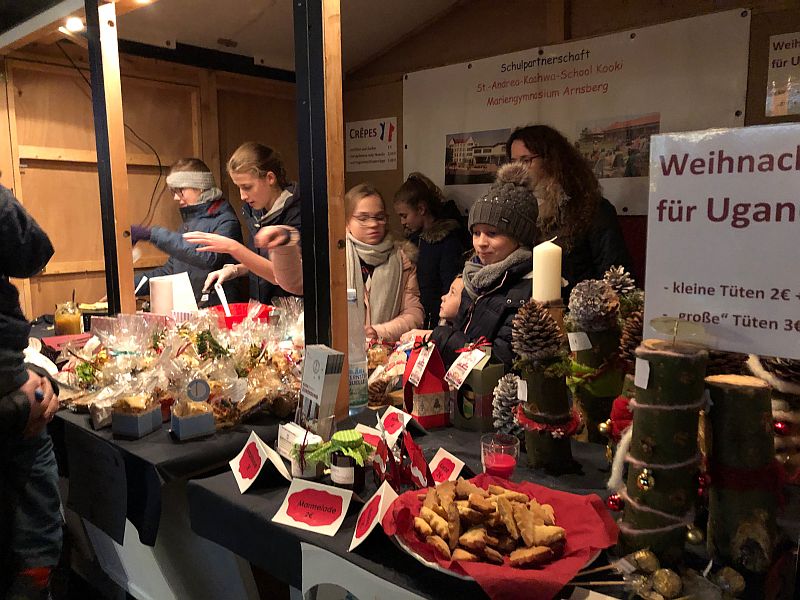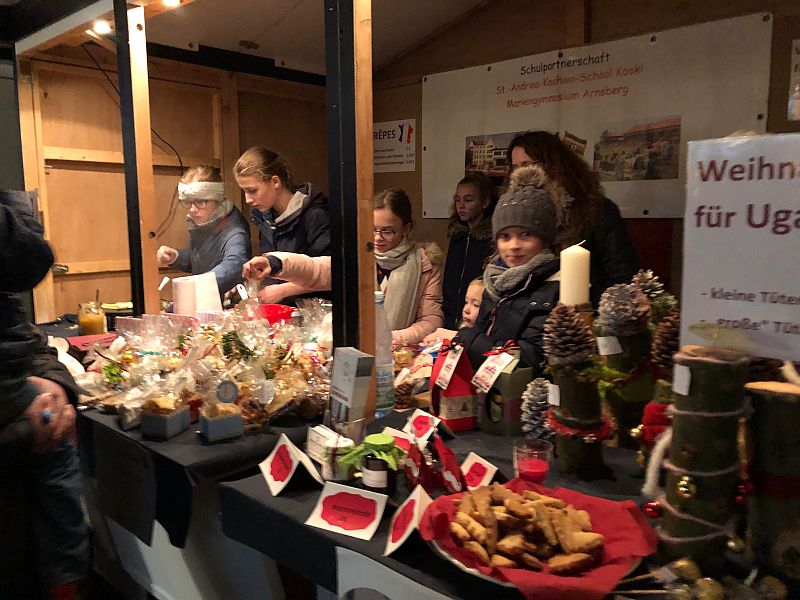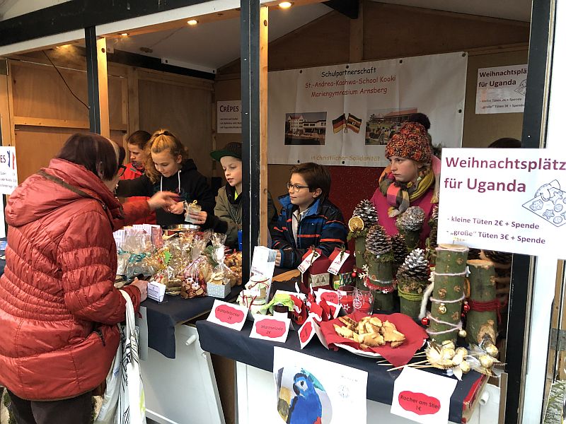 Alles in allem verbrachten wir einen tollen und erfolgreichen Tag auf dem Weihnachtsmarkt und haben uns über die vielen Besucher (u.a. Familie, Freunde und Lehrerinnen und Lehrer) gefreut und konnten eine Rekordsumme von über 1000€ für unsere Partnerschule, die St. Andrea Kaahwa-Comprehensive-School in Uganda, einnehmen. Der Erlös wird zusammen mit den Einnahmen und Spenden vom Tag der offenen Tür beim nächsten Besuch an Father Rogers persönlich übergeben werden.