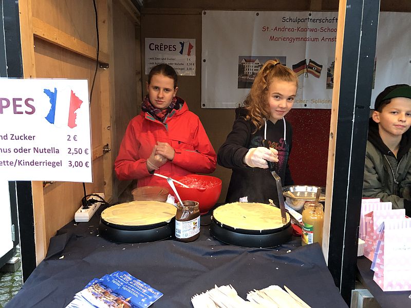 Als weiteres kulinarisches Highlight verkauften einige Schülerinnen und Schüler aus der 8c (Carolin, Benedikt, Nina, Anna, Vivian und Hannah) leckere Crêpes, welche sich ziemlich schnell als Verkaufsschlager herausstellten.