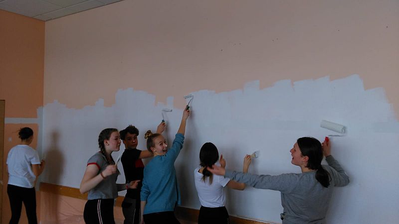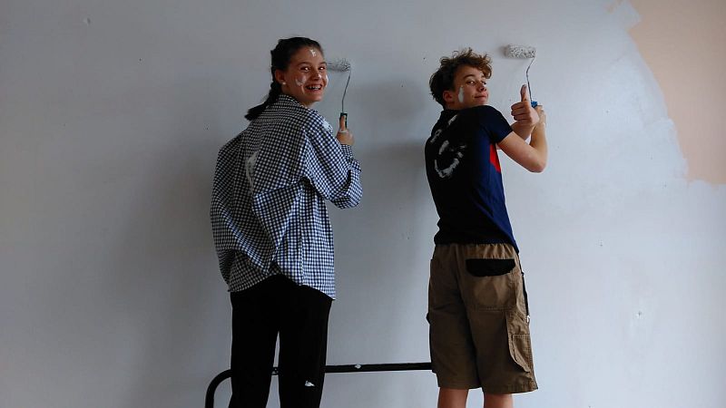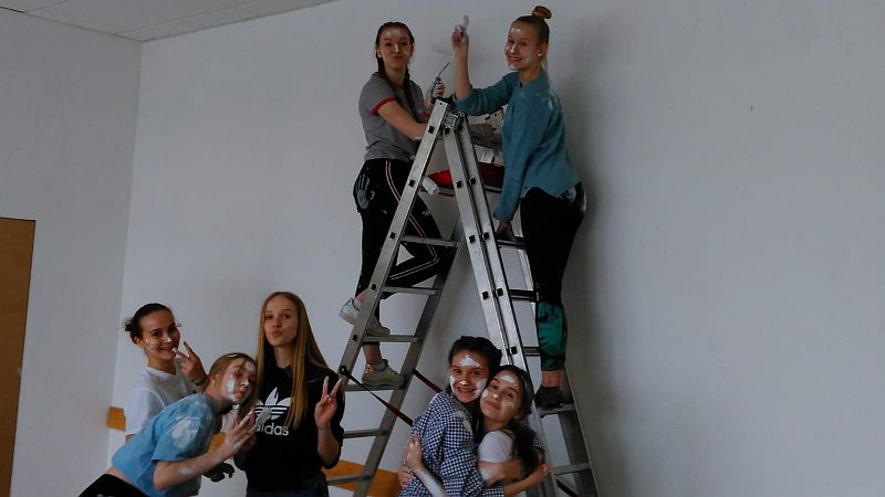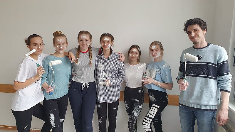 „Wie wollt ihr eure Klasse verschönern?“ Diese Frage stellte der Klassenlehrer der 9B seiner Klasse. Und diese war sich einig: Der Klassenraum sollte gestrichen werden. Die zuvor farbigen Wände sollten wieder weiß werden. Dieser Aktion stand nichts im Weg, da die Schule alle Materialien stellte. Also traf sich fast die ganze Klasse am Freitag, dem 28. Februar, nach dem Unterricht, um das in die Tat umzusetzen. In zwei Schichten klebten sie die Wände ab, pinselten und strichen alle Wände, wobei sich auch der Klassenlehrer fleißig beteiligte. Der Spaß kam dabei auch nicht zu kurz, denn neben den Wänden wurden auch die Schülerinnen und Schüler reichlich angepinselt. Dass die Farbe am Ende nicht ganz ausreichte, lag womöglich nicht zuletzt daran, dass die Farbe nicht nur zum Streichen der Wände genutzt wurde. Nach über vier Stunden erstrahlte die Klasse dann in neuem, einladendem Glanz und die Aktion hat sich wirklich gelohnt.