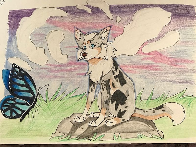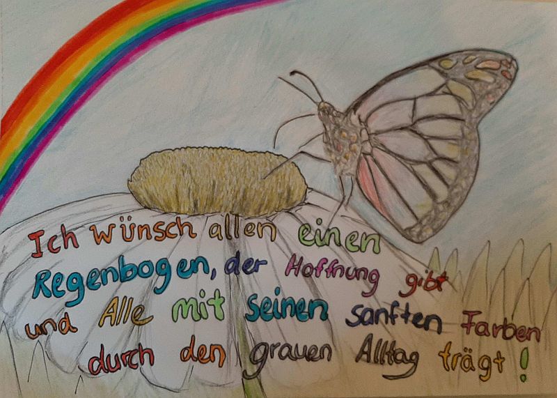 Der Schmetterling steht für den Frühling, der uns erfreut. Wir dürfen momentan keine Kontakte mit anderen Menschen aufnehmen und uns nicht mit Freunden treffen. Wer aber ein Tier hat, hat kein Kontaktverbot zu ihm. Da ist Kuscheln und Spielen immer erlaubt.