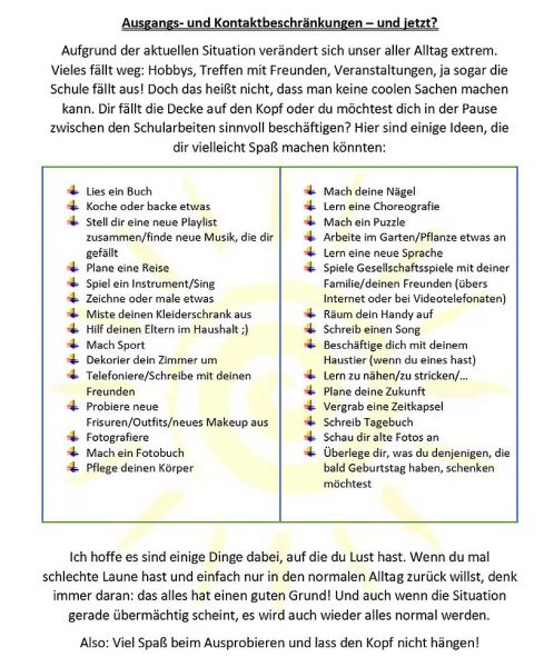 Die Corona-Krise stellt für alle Menschen weltweit eine Herausforderung dar. Viele Menschen sorgen sich und müssen mit Beeinträchtigungen zurechtkommen. Auch für unsere Schulgemeinschaft stellen die aktuellen Begebenheiten eine aufregende uns sicher keine leicht Zeit dar. Um uns gegenseitig Mut zu machen und den Blick auf positive Dinge zu wenden, ist die Idee entstanden, dass Schüler, Eltern, Sekretärinnen, Hausmeister und Lehrer kleine „Mutmacher“ kreativ gestalten. Diese sollen in regelmäßigen Abständen auf der Homepage veröffentlicht werden. Allen Beteiligten danken wir herzlich für ihren Einsatz.