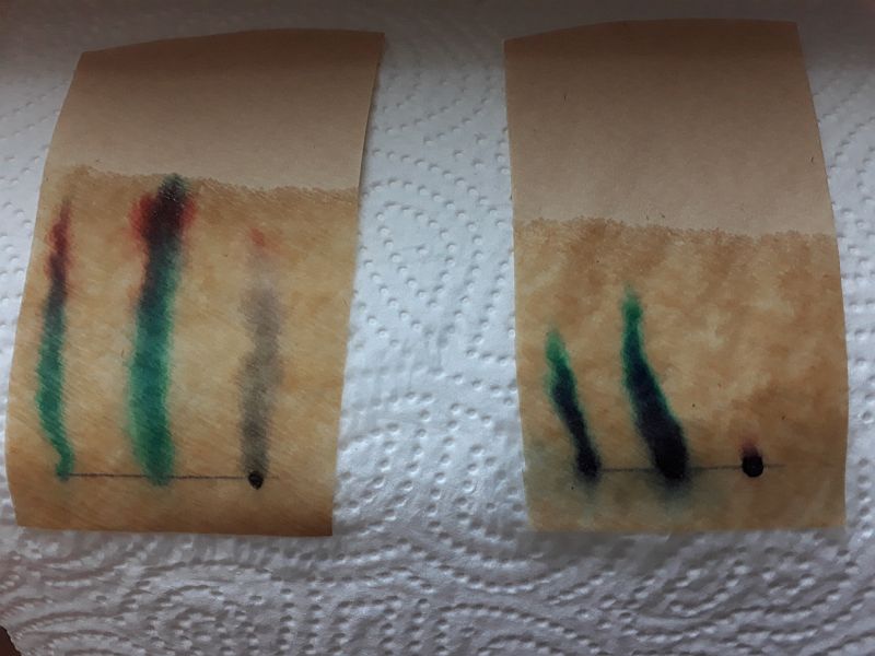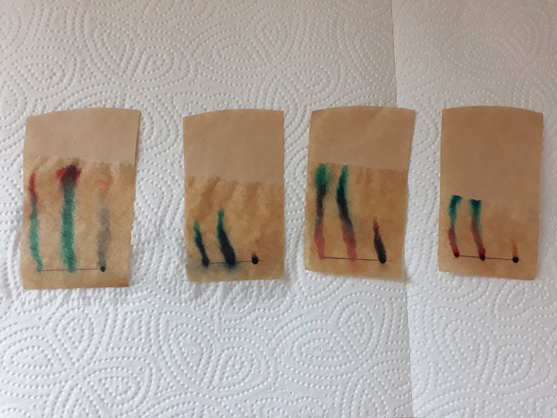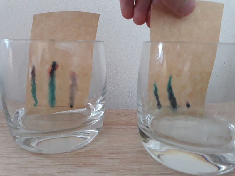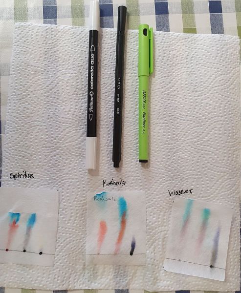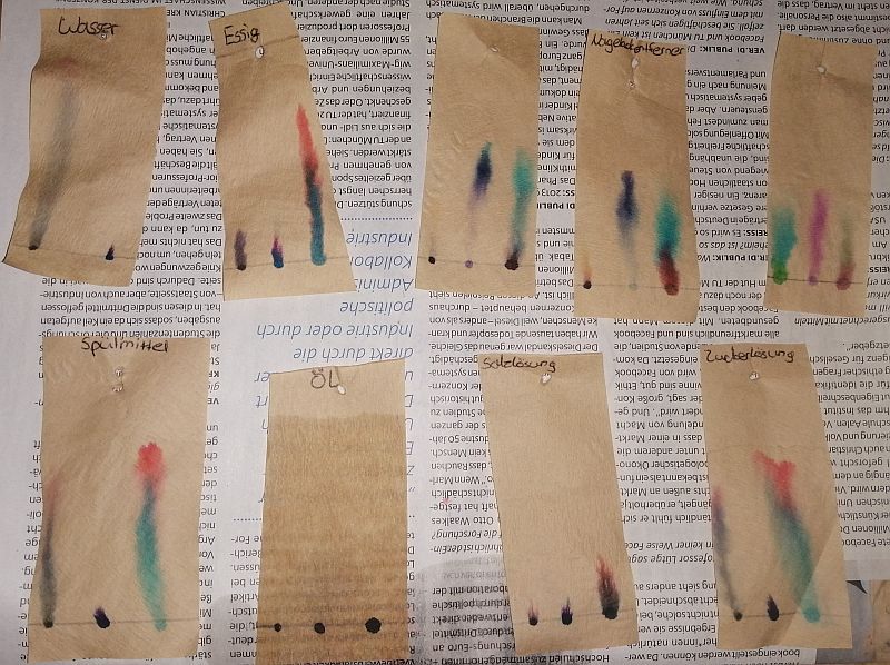 Alternativ konnten die Lernenden aber auch weitere Flüssigkeiten wie Haushaltsessig, Nagellackentferner oder Spiritus für die Chromatographie nutzen und sollten anschließend die unterschiedlichen Farbverläufe protokollieren. Einige der dabei entstandenen Chromatogramme und ein Zeitraffervideo sind mit beigefügt.