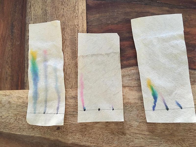 Mit Hilfe der Papierchromatographie lassen sich z.B. Filzstiftfarben in ihre einzelnen Bestandteile zerlegen.