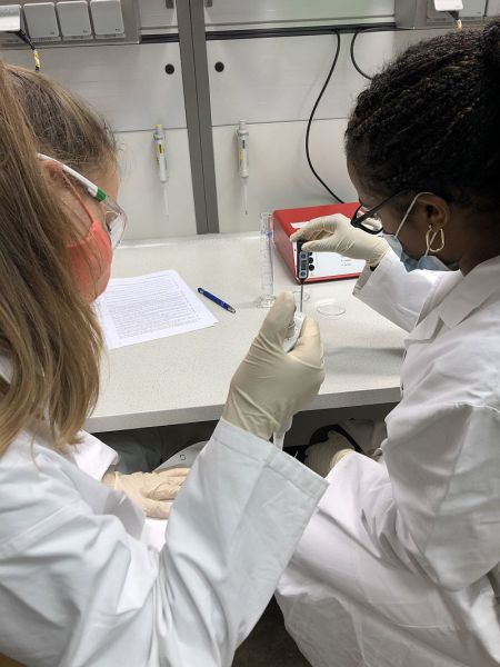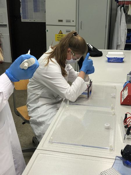 Nachdem wir uns bereits im Unterricht mit molekulargenetischen Fragestellungen auseinandergesetzt hatten, durften wir nun praktische Erfahrungen sammeln, indem wir auf Grundlage einer Untersuchung von Wurstproben die tierische Herkunft der jeweiligen Probe bestimmten. Nach einer kurzen Einweisung konnten wir daraufhin in Zweierteams zunächst die DNA isolieren, danach mithilfe der Polymerasekettenreaktion (PCR) vervielfältigen und unter Verbrauch von Restriktionsendonukleasen diese an bestimmten Positionen schneiden. Durch die darauffolgende Gelelektrophorese entstanden tierspezifische Bandenmuster, die in Verbindung mit fluoriszierenden Markern und unter UV-Licht sichtbar wurden. Dadurch war es möglich, die Herkunft unserer Wurstproben zu bestimmen.