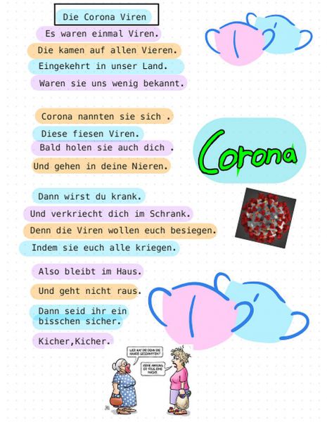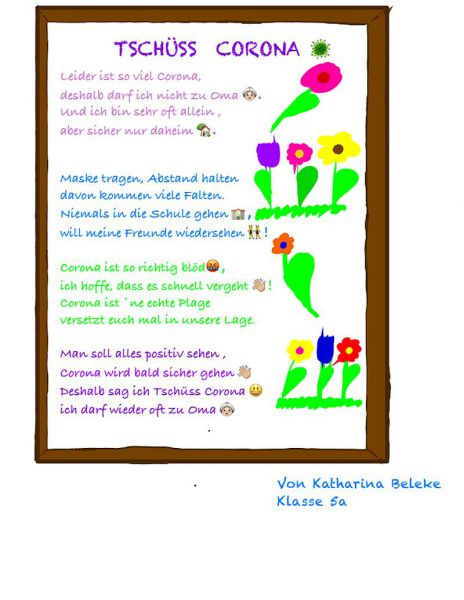 Seit Anfang Mai haben sich die Schülerinnen und Schüler der 5a im Deutschunterricht erstmals mit dem Thema Gedichte beschäftigt. An Gedichten z.B. von Wilhelm Busch, A. H. Hoffmann von Fallersleben, Ludwig Uhland, Josef Guggenmos und Jutta Richter wurden Merkmale von Gedichten wie Vers, Strophe, Reim, Reimformen und das Versmaß (Metrum) bestimmt. Dann hieß es: „Schreibt selbst ein Gedicht zum Thema CORONA“!