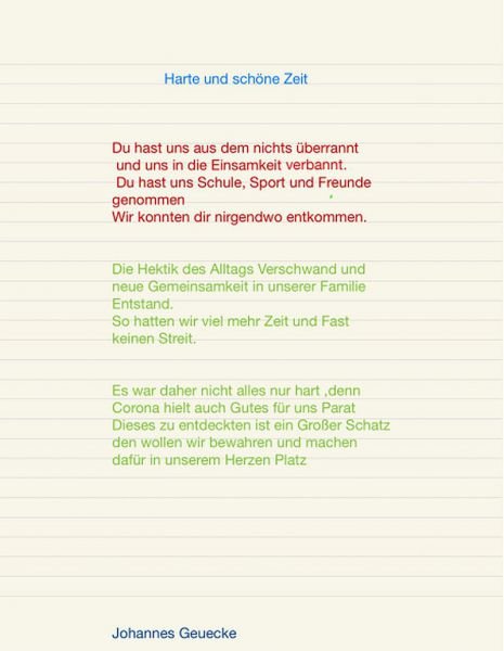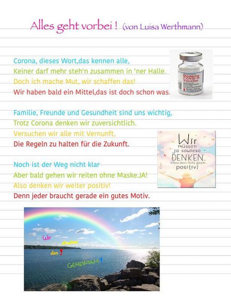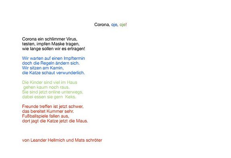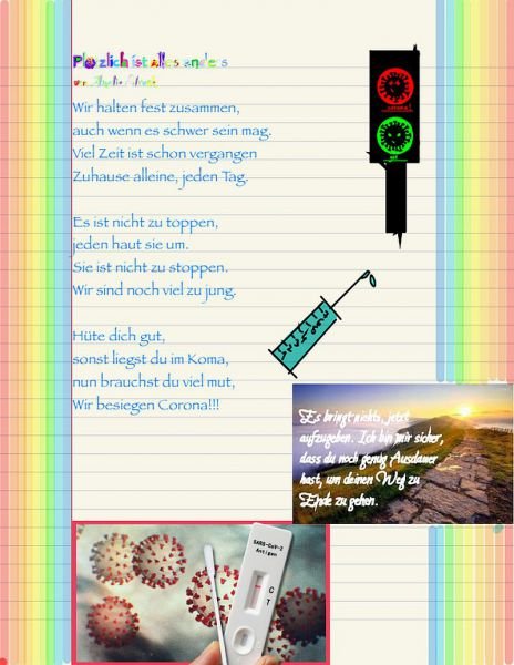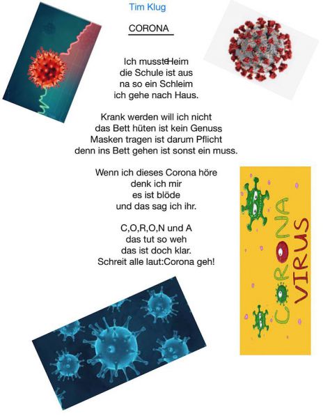 Teilweise regen die Gedichte zum Schmunzeln an. Sie spiegeln aber vor allem viele verschiedene Gefühlslagen der Kinder in Verbindung mit CORONA wider wie z.B. Wut, Einsamkeit, aber auch Hoffnung auf ein Ende der Pandemie, Hoffnung auf Normalität.