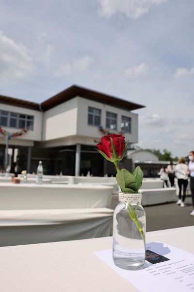 Bei der Übergabe der Abiturzeugnisse gab es viele strahlende Gesichter. Corona-bedingt fand die weitere Feier bei herrlichem Wetter an den Familientischen statt; auch Fotos mit der eigenen Familie oder von Gruppen innerhalb des Abiturjahrgangs wurden bis in den Abend angefertigt. Für den perfekten Service an den Tischen sorgte eine Reihe von Schülerinnen und Schülern der Q1.