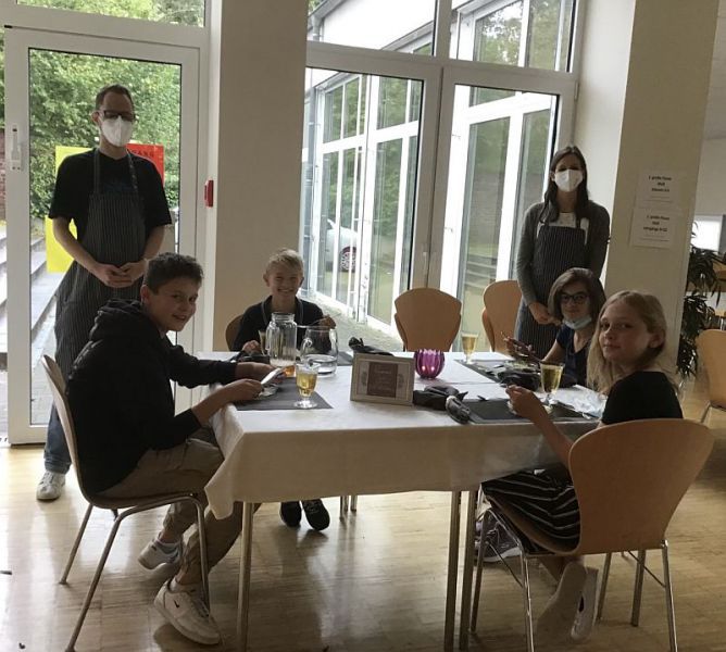 Am 16. September wurden wir in der 6. Stunde von unserer Klasssenlehrerin Frau Goldbach und unserem Klassenlehrer Herrn Markwald in die Cafeteria vom eingeladen. Sie haben eine Überraschung für uns geplant, weil wir auf unserer Klassenfahrt auf Norderney die EduBreakout-Ralley gewonnen hatten. Also gingen wir schick, wie gewünscht, und pünktlich um 11.55 Uhr in die Cafeteria. Wir sahen einen sehr schön gedeckten Tisch und wussten sofort, der muss für uns sein. Im gleichen Augenblick sahen wir Herrn Markwald und Frau Goldbach. Sie waren als Kellner gekleidet und begrüßten uns ganz herzlich. Wir bekamen ein 3-Gänge-Menü mit Getränken und wurden die ganze Zeit von ihnen bedient. Es war sehr lecker. Wir genossen die besondere Atmosphäre mit unseren Lehrern und hatten eine Menge Spaß.