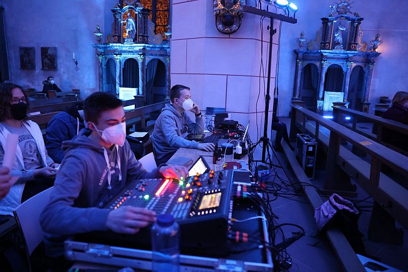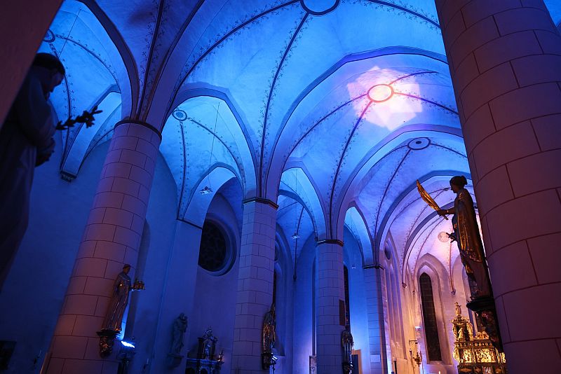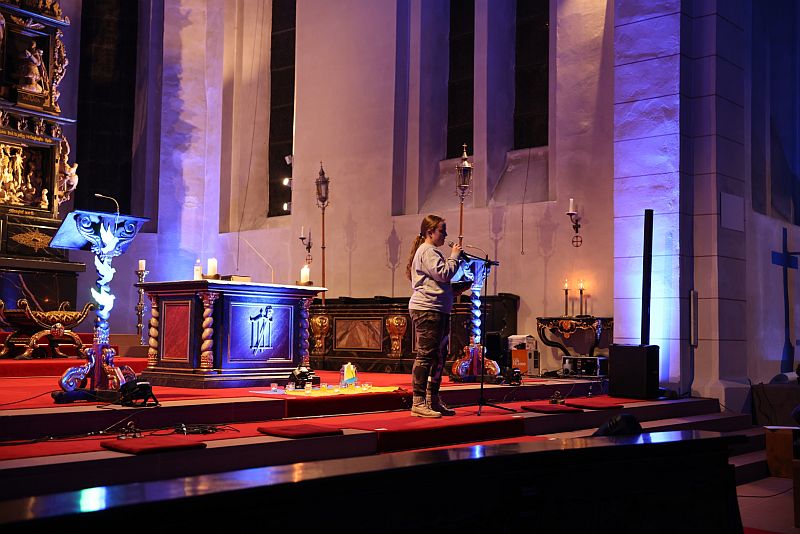 Die Kirche wurde dabei von Julian Krick und Leo Korte mit einer Reihe verschiedener Szenen in den Farben der Ukraine illuminiert. Außerdem sorgten die beiden für einen guten Klang in der Kirche. Ben Golz erstellte eine Reihe von Fotos von der Veranstaltung.