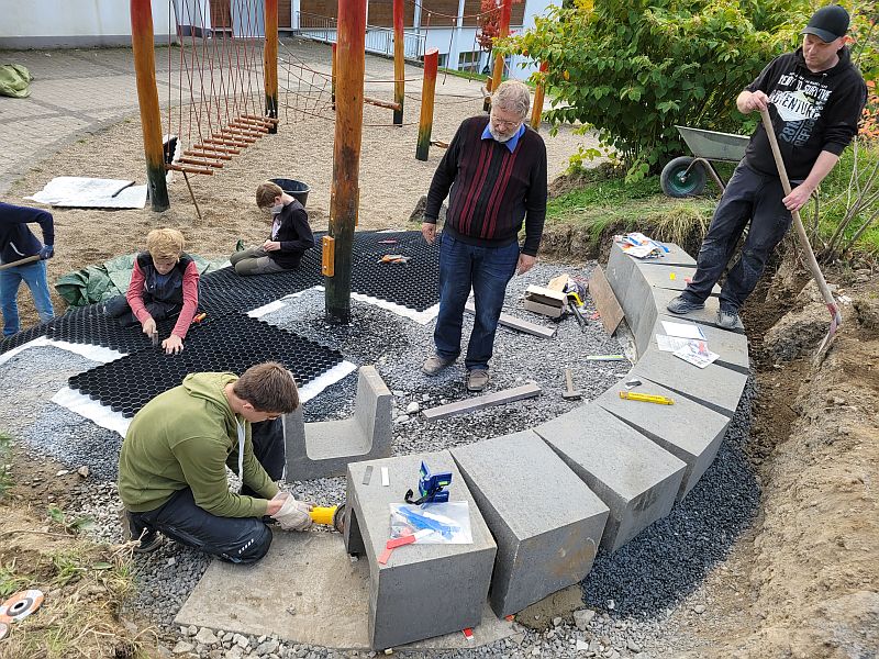In den Erdhang wurde schließlich eine Sitzgruppe aus U-Steinen eingepasst. So wird der Hang zum Parkplatz abgefangen und es kann keine Erde auf die Hangelstrecke rutschen.