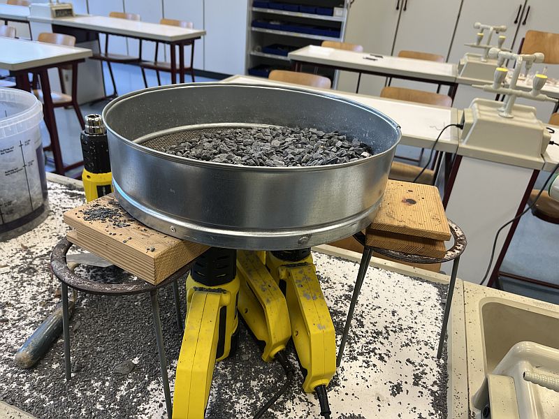 So gab es im Chemieraum eine Trockenstation mit mehr als einem Dutzend Heißluftgebläsen und Profi-Föns. Im großen Sieb fand die Endtrocknung statt, damit der Splitt vor dem Verkleben mit Epoxidharz staubfrei und trocken war. Jeweils 35 kg Splitt konnten in einer Charge verklebt werden. Daher war der Raum zwischendurch ein Lager für Behälter mit trockenem Splitt.