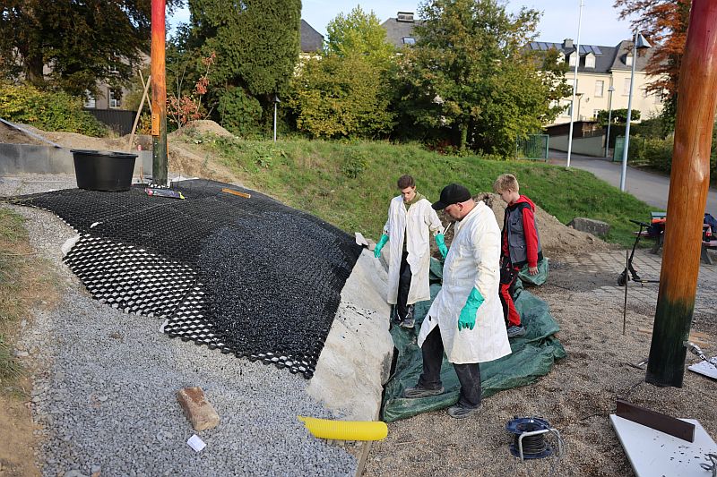 Die bereits fest einbetonierten Steine am Rand der Kletteranlage wurden um weitere Steine ergänzt, welche mit Beton ummantelt wurden, sodass sich eine glatte Oberfläche ergab. Das steile Gelände wurde mit Splitt befestigt, der auf Kiesgittern mit Epoxidharz verklebt wurde. Beim Arbeiten mit Epoxidharz wurde die Sicherheit großgeschrieben. Es wurde gewährleistet, dass kein Kontakt mit den Händen zustandekam.