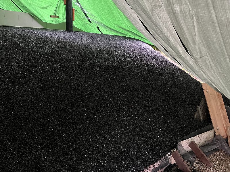 Mit dem Kunststoffgranulat EPDM wurden darauf eine mit Polyurethanharz verklebte, dicke Fallschutzschicht und die erdfarbene Laufschicht aufgebaut. Auch dafür mussten kreative Lösungen für das Anbringen in den steilen Bereichen des Hangs gefunden werden. Ein improvisiertes Zelt sollte den bisherigen Bau vor Regen und Tau schützen. In den steilsten Bereichen wurde die Dämpfungsschicht bis zum Aushärten des Klebers geschützt, damit die Masse nicht abrutschen konnte.