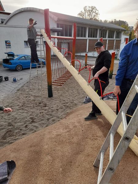 Am Anfang stand die Idee eines Schülers: Unsere Spielgeräte gefielen ihm, aber eine Hangelstrecke würde noch fehlen! Daraus erwuchs eines der aufwändigsten Projekte unseres „Bau-Teams“ um Herrn Beine.