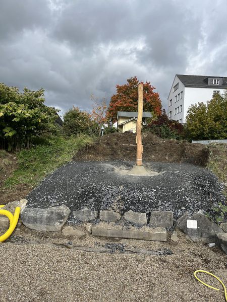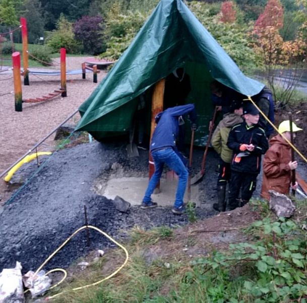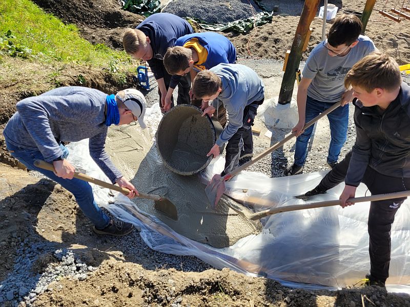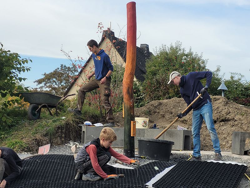 Ein zusätzlicher Mast für die Hangelstrecke wurde trotz Regenwetter im Hang einbetoniert. Dabei musste der Abstand zur bestehenden Kletteranlage genau eingehalten werden, damit später die Hangelstrecke passend eingebaut werden konnte. Kreative Zeltkonstruktionen schützten die Erbauer und die frisch erstellten Anlagenteile vor Regen.