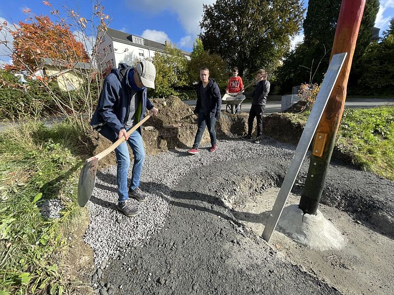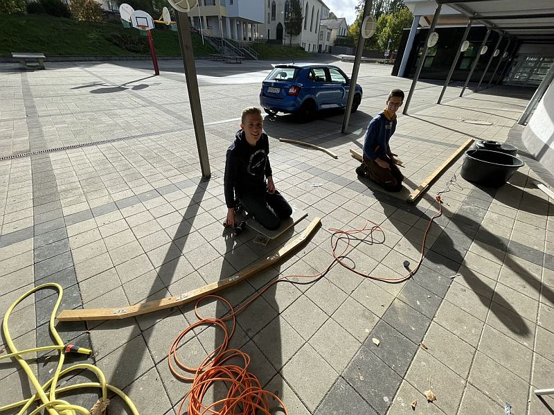 Seit Beginn der Herbstferien haben knapp 20 Lernende der Stufen 6 bis Q1 und Ehemalige (Abi 2022) zusammen mit Herrn Beine, Hannes Burmann und Herrn Porombka unsere Kletteranlage um eine 5,50 m lange Hangelstrecke erweitert. Von den dabei neu gebauten Sitzplätzen aus hat man einen tollen Blick über das Schulgelände.