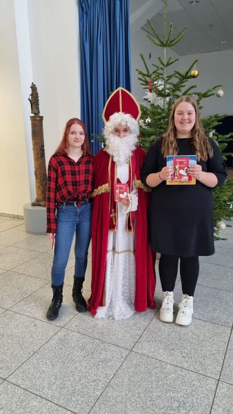 Gespielt wurde der Nikolaus von Franziska Heymer (9a), die Geschichte wurde von Hannah Bischof (9a) vorgelesen. Eleonore Wodke (9a) verteilte die Schokoladennikoläuse.