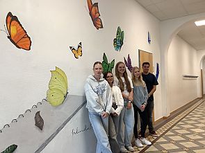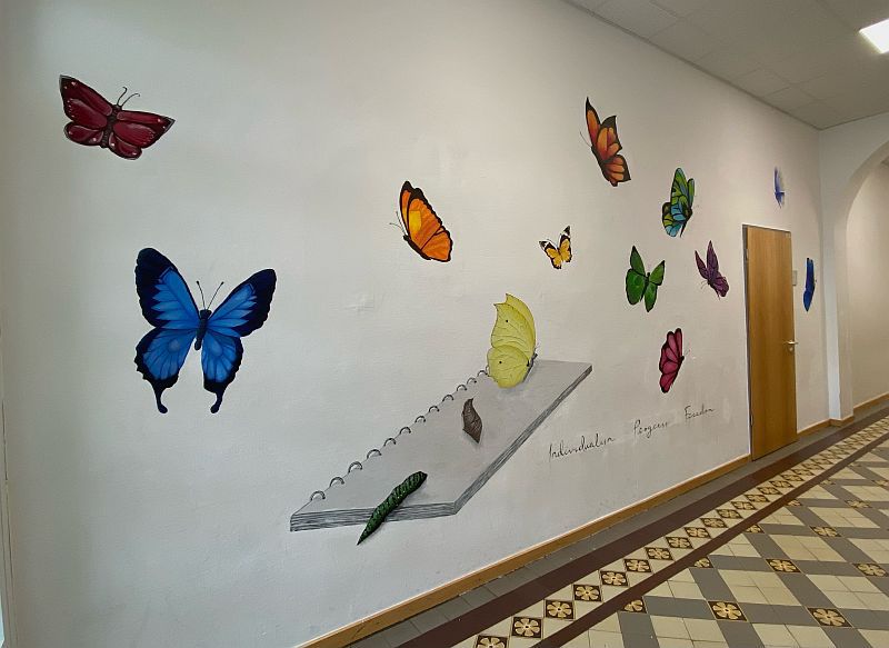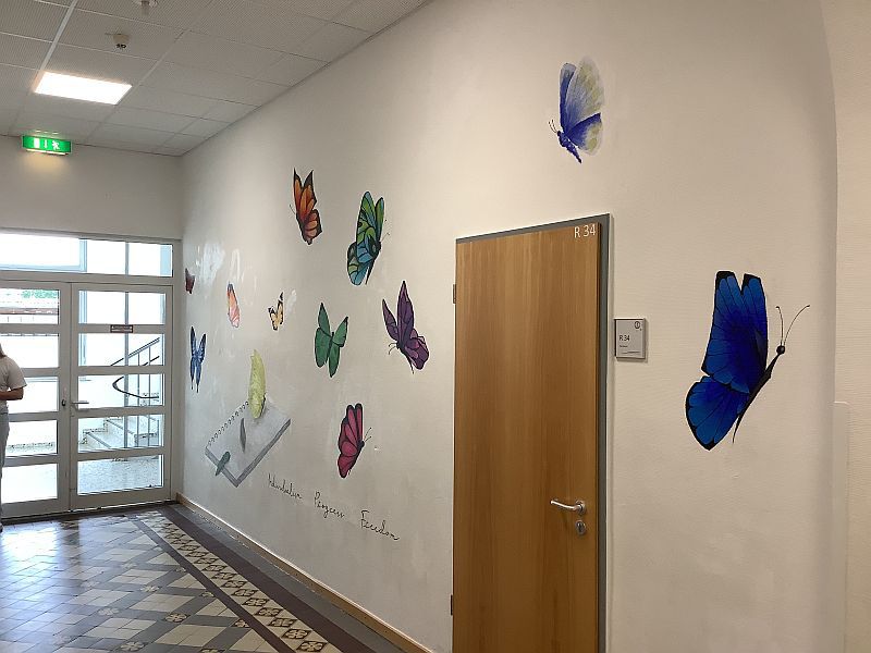 Wir, der Kunstkurs aus der Stufe Q1, haben mit der Unterstützung von Herrn von Rüden und Frau Hektor eine Wand unserer Schule mit unserer eigenen Idee kreativ gestalten dürfen. Im Vorfeld haben wir uns im Rahmen des Unterrichts mit der Wandmalerei beschäftigt und anschließend zahlreiche Ideen gesammelt, wie die Wand aussehen soll und wie dies am besten umzusetzen ist. Unsere Ideen haben wir zunächst als Entwürfe auf Papier mit Acrylfarbe gemalt und uns anhand dessen für ein Motiv entschieden. Wichtig war uns auch, dass es ein Motiv mit tieferer Bedeutung für unsere Schule ist. Die Entwicklung der Raupe zum Schmetterling auf dem Notizblock stellt den Entwicklungsprozess jedes Individuums während seiner Schulzeit dar.