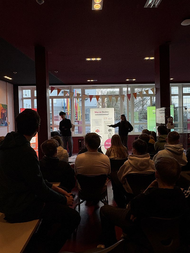 Die interaktive Ausstellung thematisierte die Gefahren des Rechtsextremismus für unsere Gesellschaft und zeigte, wie Demokratie aktiv verteidigt und gefördert werden kann. Sie informierte über die verschiedenen Facetten des Rechtsextremismus, von ideologischen Grundlagen über extremistische Organisationen bis hin zu rechtsextrem motivierten Straftaten. Besonders berücksichtigt wurden aktuelle gesellschaftliche Entwicklungen.