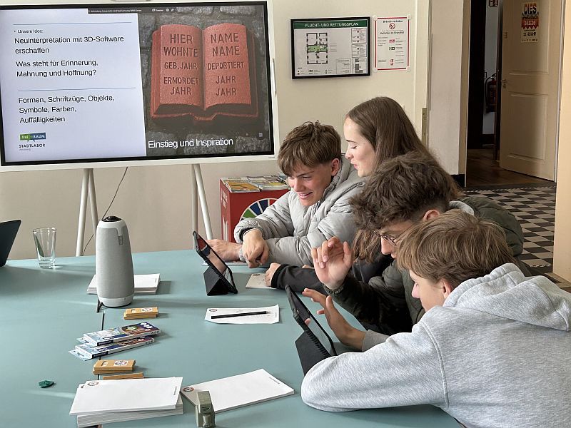 Der zweite Teil des Projekts fand eine Woche später im Stadtlabor freiRAUM statt. In Kleingruppen entwickelten die Schülerinnen und Schüler Ideen, wie Stolpersteine sichtbarer und zeitgemäßer gestaltet werden könnten.