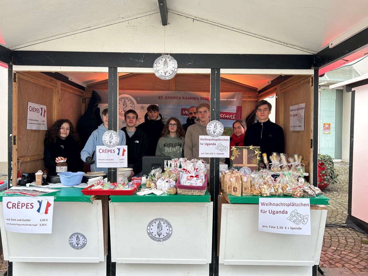 Unter dem Motto „Plätzchen und Crêpes für Uganda“ engagierten sich Schülerinnen und Schüler der Klassen 5b, 6b, 6c, 7b, 9a, 9b und 10b sowie die Technik-AG. Gemeinsam mit ihren Klassenleitungen sorgten sie am Stand für gute Stimmung und reibungslose Abläufe.
