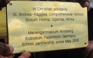 Im Oktober des Jahres 2008 bekam unsere Schule Besuch eines Missio- Chores aus Uganda, der zur Hälfte aus Schülerinnen unserer späteren Partnerschule bestand. Dieser wurde im Bereich Arnsberg von Josef Mündelein, dem Dekanatsreferenten des Dekanates Hochsauerland West betreut. Aus dieser Betreuung der Schülergruppe wurde für Herrn Mündelein eine Herzensangelegenheit, die sich schon bald auf das Mariengymnasium übertragen sollte. Über Weihnachten reiste Herr Mündelein nach Uganda, um die begonnene Freundschaft zu vertiefen. Von seinen tiefgreifenden Eindrücken in Uganda und an der späteren Partnerschule berichtete er einzelnen Lehrern der Schule, woraus sich die Idee entwickelte, dass wir als Schule z.B. im Rahmen des Tages der offenen Tür etwas für die St. Andrea Kaahwa-Comprehensive School unternehmen könnten. Gern war Herr Mündelein bereit, den Schülerinnen und Schülern der Klasse 8 b einen bildgestützten Vortrag über Uganda und seinen Besuch an der Schule zu halten. Mit Herz und Hand gingen die Schüler nun am Tag der offenen Tür im Jahr 2009 daran, Kaffee, Kuchen und Schokoladenspieße für den guten Zweck zu verkaufen. Unterstützt wurden sie von den Eltern, die bereitwillig die Zutaten spendeten, sodass ein großer Reinerlös erzielt werden konnte, der einer Patenschaft für eine Schülerin zugute kommen sollte. Übergeben werden konnte das Geld in einer netten Feierstunde persönlich, da Basirisa Asiimwe, Lehrerin an der St. Andrea Kaahwa Schule als Gast der Mündeleins über Weihnachten in Arnsberg weilte. Zu diesem Zeitpunkt konnten weitere Lehrer Kontakt mit einer Lehrerin aus Uganda knüpfen, da Basirisa gern bereit war, im Pädagogikleistungskurs über das Schulsystem in Uganda zu berichten.