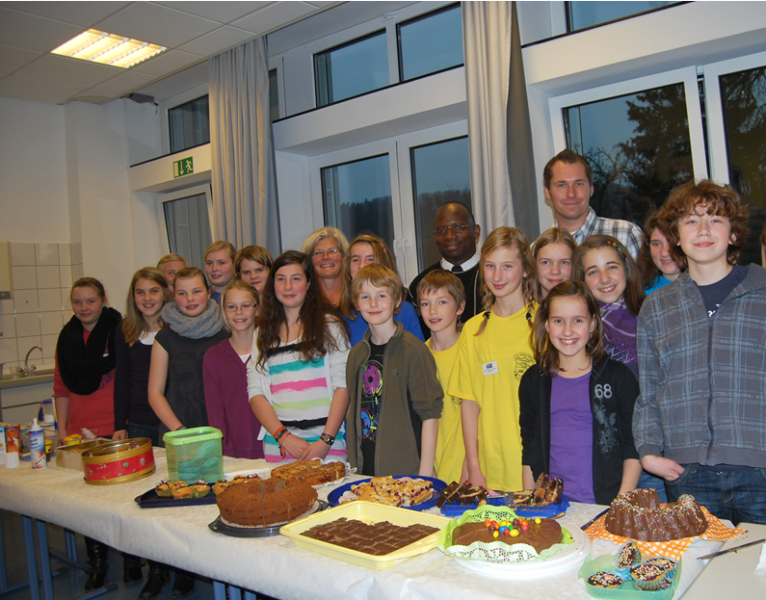 Die guten Erfolge am Tag der offenen Tür konnten auch im Folgejahr gesteigert werden. Die ehemaligen Neuner von Herrn Kirschner waren nun zwar Oberstufenschüler, aber viele ließen es sich nicht nehmen, die 5a, die unter Leitung von Frau Wolf und Herrn Kirschner, das Erbe an dem Tag der offenen Tür antraten, tatkräftig zu unterstützen. Die Fünfer verstanden ihrerseits mit kindlichem Elan die Aktion voranzutreiben. Neben Kuchen, Waffeln, Kochbüchern, aus Einwegdosen vom Kunstkurs gefertigten Kerzenständern entwickelte sich afrikanischer Saft zum Verkaufsschlager. Zudem wurden afrikanische Klänge auf Trommeln einstudiert, um den Gästen ein landestypischen Eindruck vermitteln zu können. Die Bereitschaft, sich für die Partnerschule einzusetzen, konnte von Jahr zu Jahr auf mehr Schultern verteilt werden und wird von den Schülern sowohl sinnvoll als auch „normal“ empfunden. Erfreulich war dabei natürlich auch, dass der Ertrag erstmals vierstellig wurde, sodass im folgenden Jahr vier Schüler unterstützt werden konnten. Die Geldübergabe wurde für die Schüler der Klasse 5a dann ebenfalls zum Erlebnis, denn Father Rogers und Father Josef nahmen in einer Feierstunde das Geld entgegen. Hierbei konnten erste Englischkenntnisse probiert und gemeinsamer Gesang eingeübt werden.